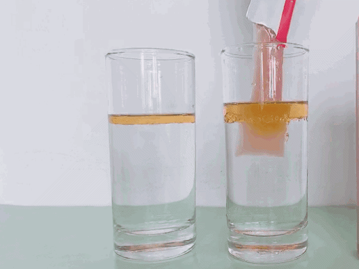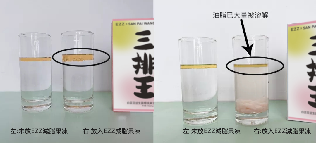 第一組對比實驗:準備了兩個倒了油的杯子,選擇其中一個杯子放入減脂果凍